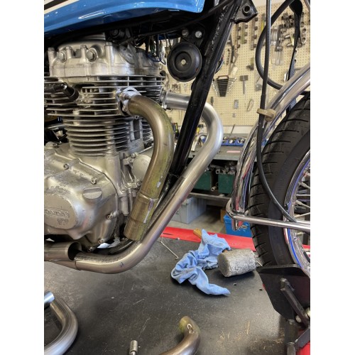 This is our new RRR/Hindle Stainless Steel Exhaust for the 1972-77 Honda CB350F/400F. All our Vintage Systems are now purge welded for additional flow. For such a small engine the gains in horsepower and torque with just our new exhaust were amazing. Our test bike improved on peak power from 24hp to 28hp with major gains from 4,000rpm all the way to 9,000rpm.