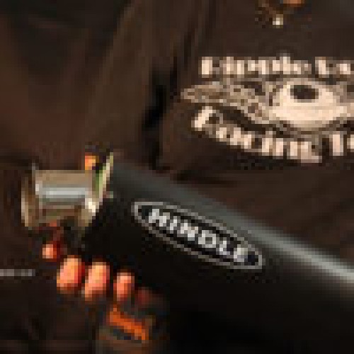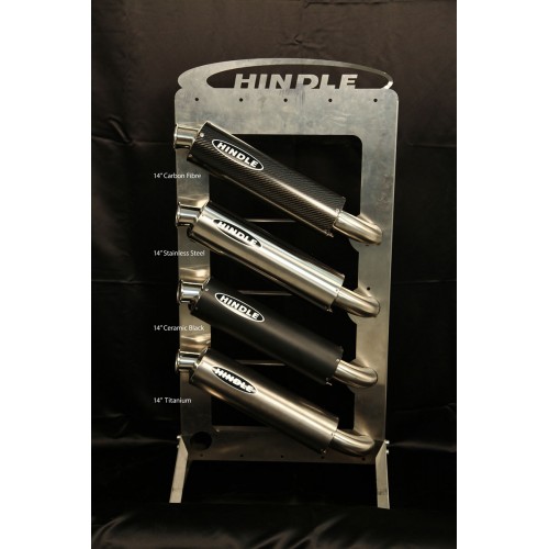 RRR/Hindle Supersport Mufflers are a 4 inch in diameter round canister style as were performance fitted during the 80’s-90’s on most Japanese Motorcycles. The Mufflers come in three lengths: 14″, 16″ and 18″ and are available in Stainless Steel, Carbon Fiber, Titanium and Stainless with Ceramic Coating Black. All Muffler sizes (14,16, 18″) fit all our exhaust systems and mount identically, so no matter what bike or model you have, the RRR/Hindle Supersport Mufflers will bolt up to your bike the same way on any of our RRR/Hindle Vintage Racing Exhaust Systems. The Mufflers are a straight through design with a mild steel perforated baffle core surrounded by SS wool and ceramic wrap for long term durability. The Supersport Mufflers have a 2 inch inlet and a 1 3/4 inch outlet. The Supersports have a straight through design for maximum exhaust flow and are tuned to work with all of our Hindle Headers. The 14″ has the loudest sound while the 16″ is popular for track day noise restrictions as is the 18″. We also offer a STEALTH core packing, at no extra charge, which is very quiet for sneaking home late at night or for long touring trips. Each muffler comes with a round muffler strap with inner rubber cover to prevent chaffing. The mufflers are designed to mount to the rear footpeg mount either directly or with a bracket or spacer provided. The muffler also has two spring tabs welded to the bottom side inlet for spring mounting the muffler to the tail pipe.